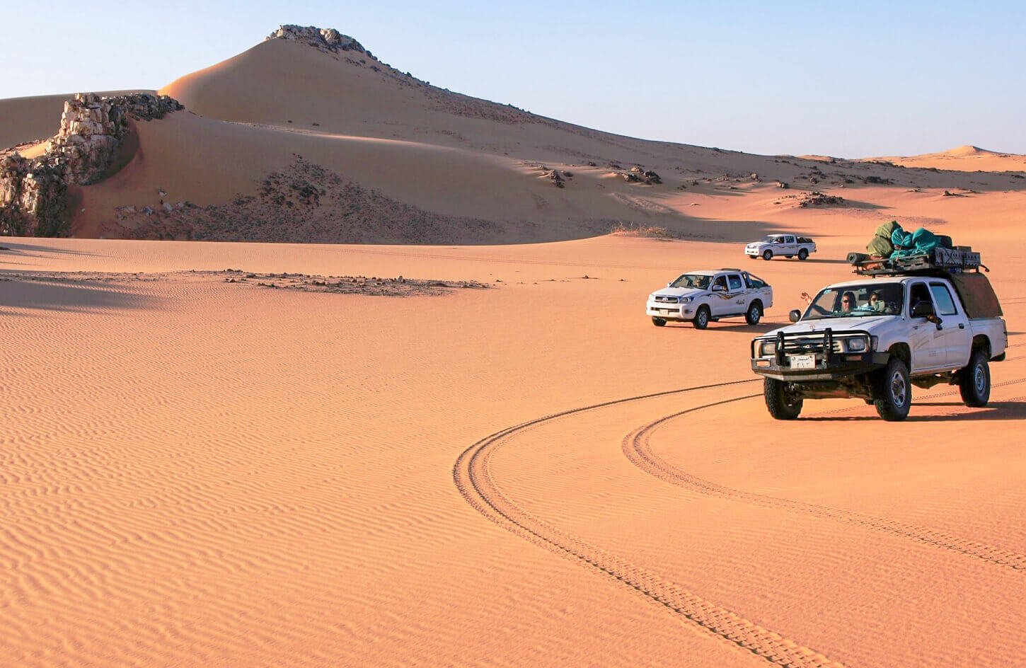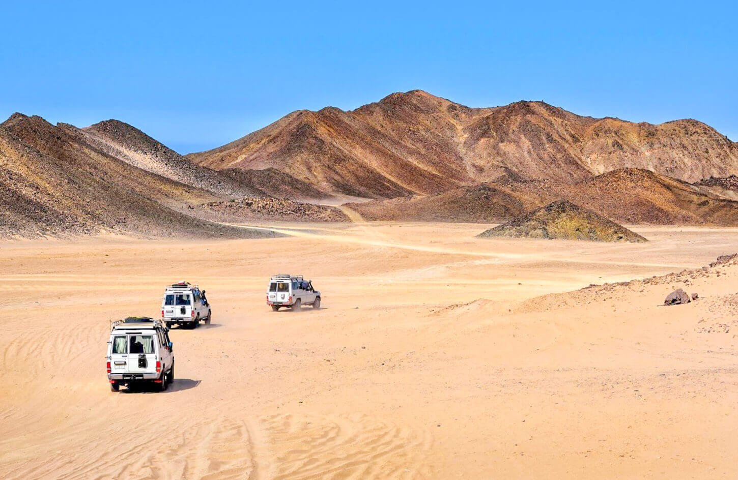 Your adventure begins with an exhilarating 4×4 Jeep ride across the vast Hurghada desert, navigating through rugged terrain and towering sand dunes.