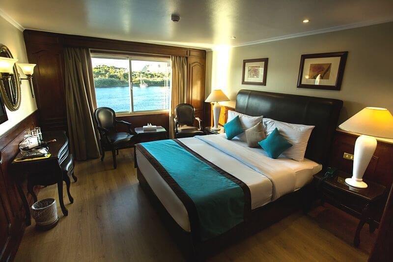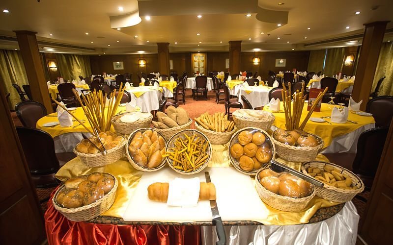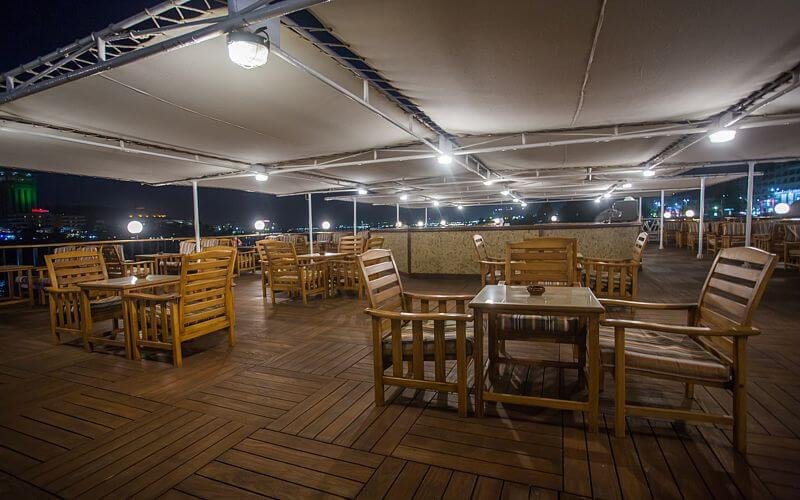 The cruise also boasts a dedicated bar area with cozy Chesterfield sofas and panoramic Nile views—ideal for a peaceful retreat with a good book. The expansive sun deck offers a swimming pool and bar, surrounded by stylish cane tables, chairs, and sun loungers, ensuring ultimate relaxation under the sun. A 24-hour reception is available for all services, including international phone access and safe deposit boxes. Additionally, the onboard gift shop sells a variety of practical items and Egyptian souvenirs.