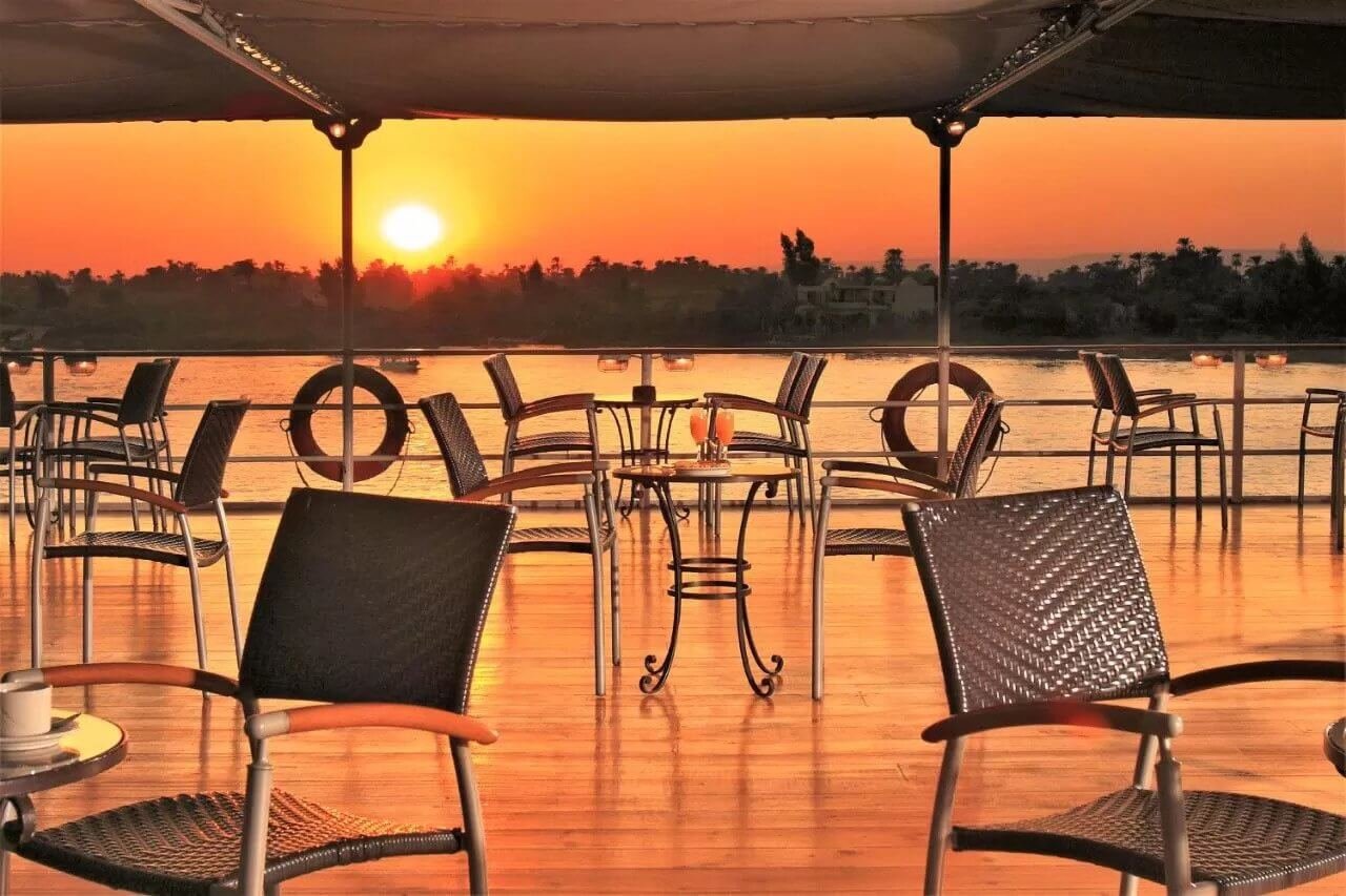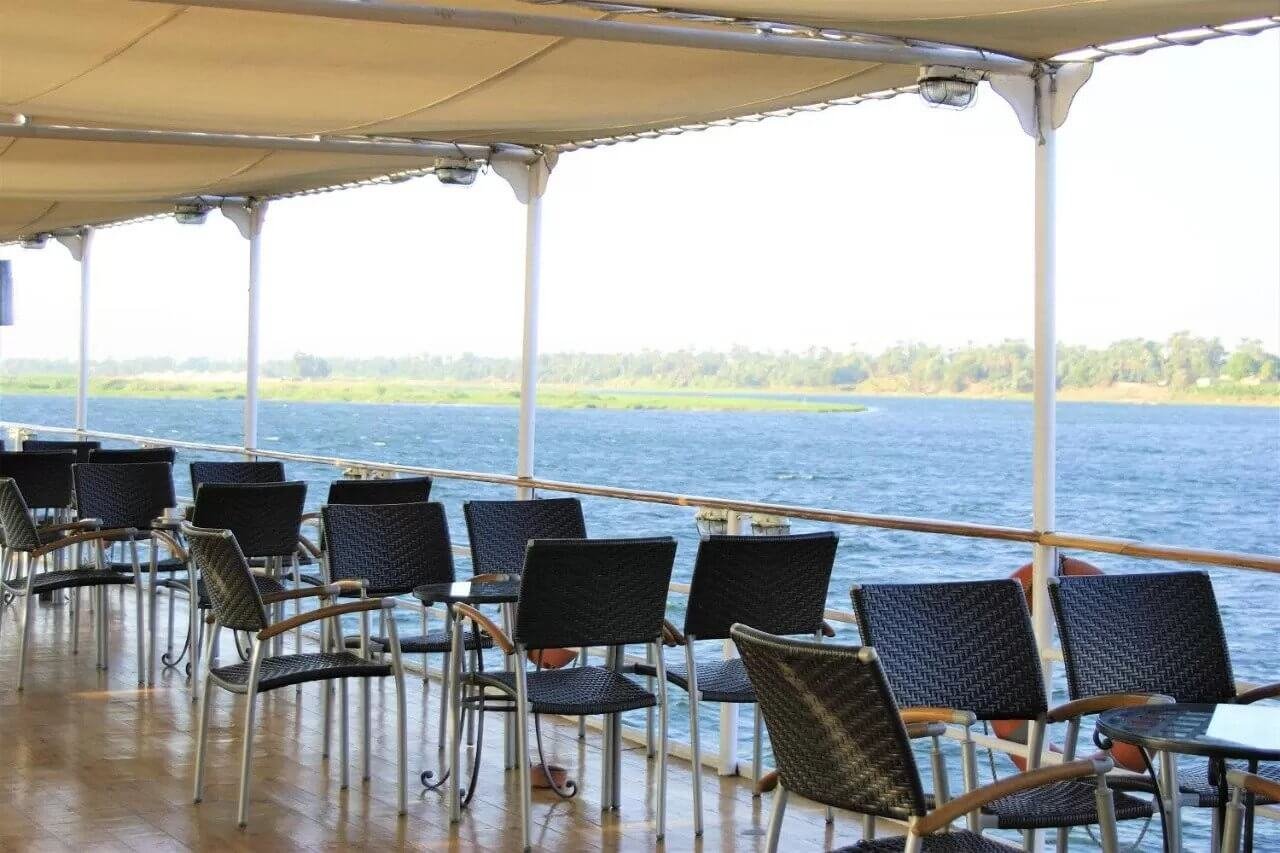Guests can enjoy their meals while overlooking breathtaking views of the Nile. The onboard lounge offers a relaxed atmosphere with a full bar, perfect for unwinding after a day of exploring.For relaxation and recreation, the Steigenberger Royale has a large sun deck, complete with a swimming pool and comfortable sun loungers, where you can enjoy the pleasant weather and the scenic river views. The cruise also features entertainment options, including live music and traditional Egyptian shows, providing an enriching cultural experience.